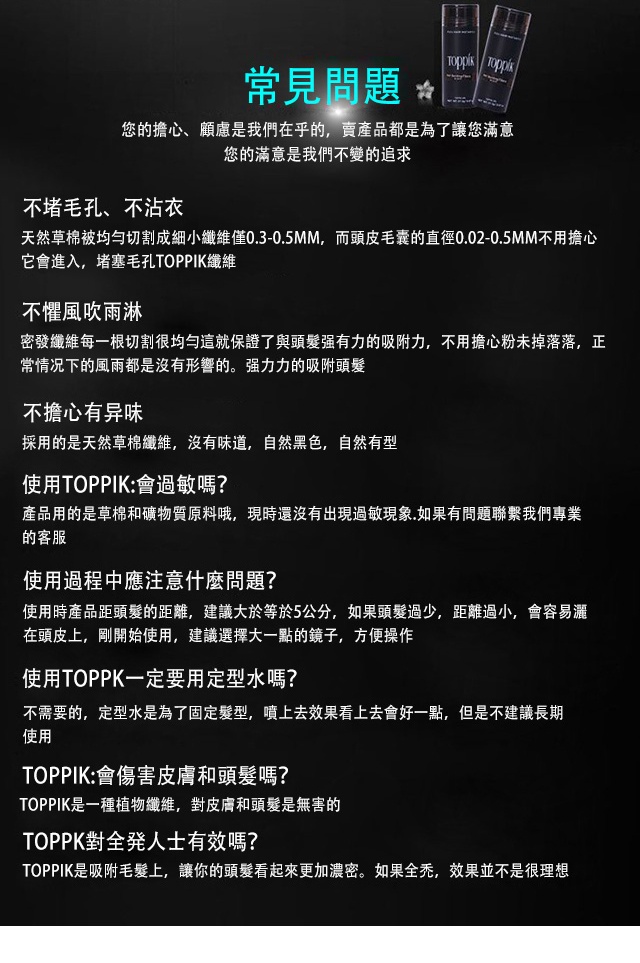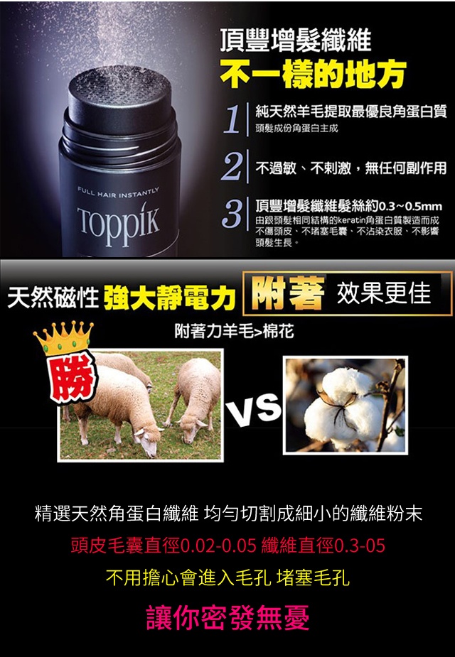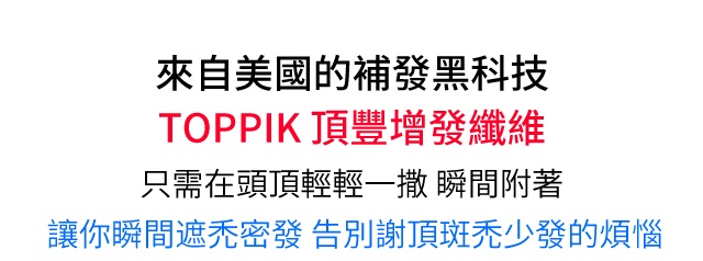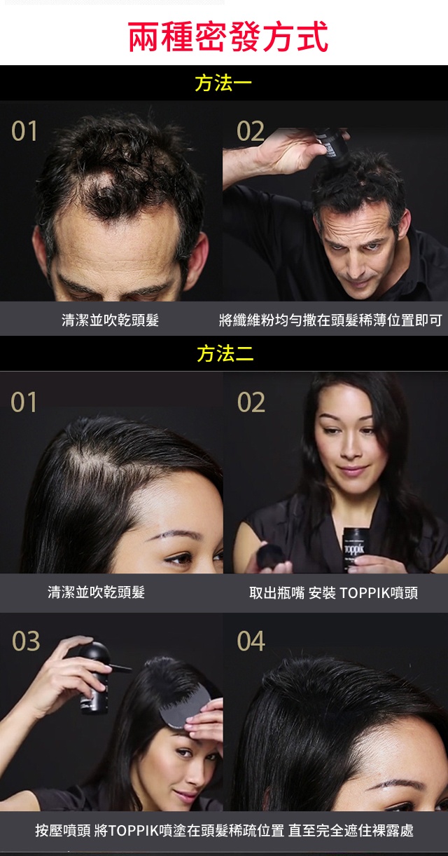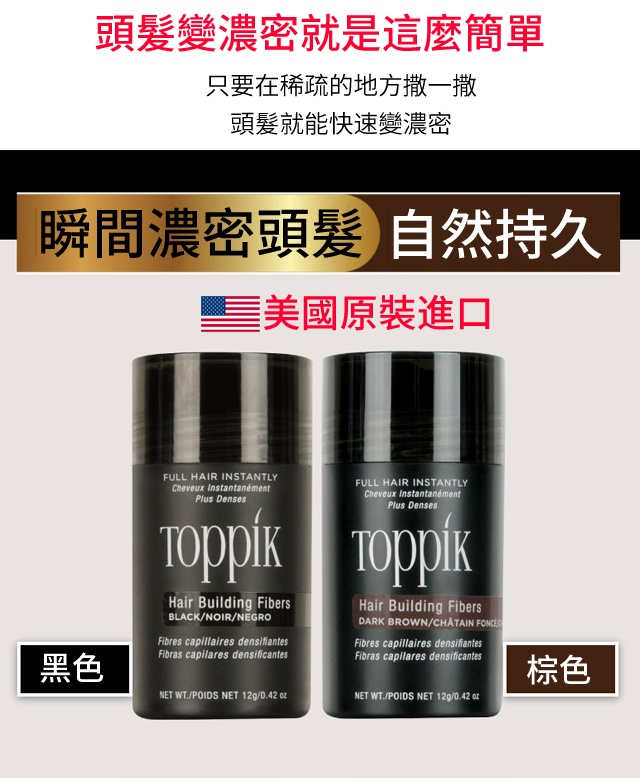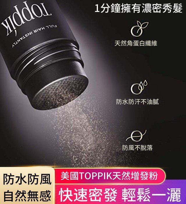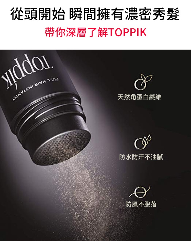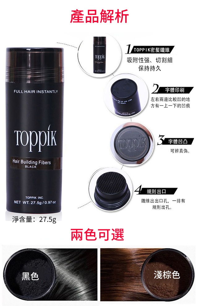 現貨Toppik增髮纖維假髮,防水增髮粉,掉髮救星,脫髮救星,長度為約0.3~0.5毫米短纖維和大小適中長纖維,增髮纖維,改善稀疏髮量,頂豐(Toppik)增髮纖維假髮類似髮絲狀,會吸附在頭髮上,讓頭髮有視覺增髮的感覺,且纖維的形狀通過直髮和捲髮時,非常容易附著在髮絲上,讓頭髮看起來更自然。